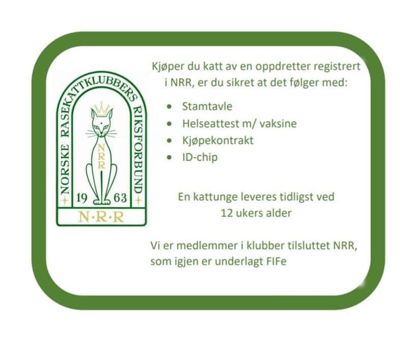 Våre kattunger er registrert i NRR og dem får med seg NRR stamtavle, kjøpskontrakt og helseattest fra NRR + en gave fra for produsenten og også en gave fra oss som inn holder mat som dem er vant med + litt leker og et lite teppe så det ikke blir så stor overgang for en liten kattunge.